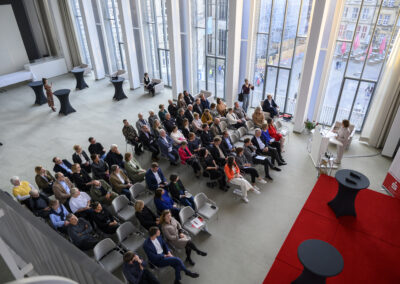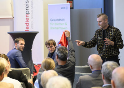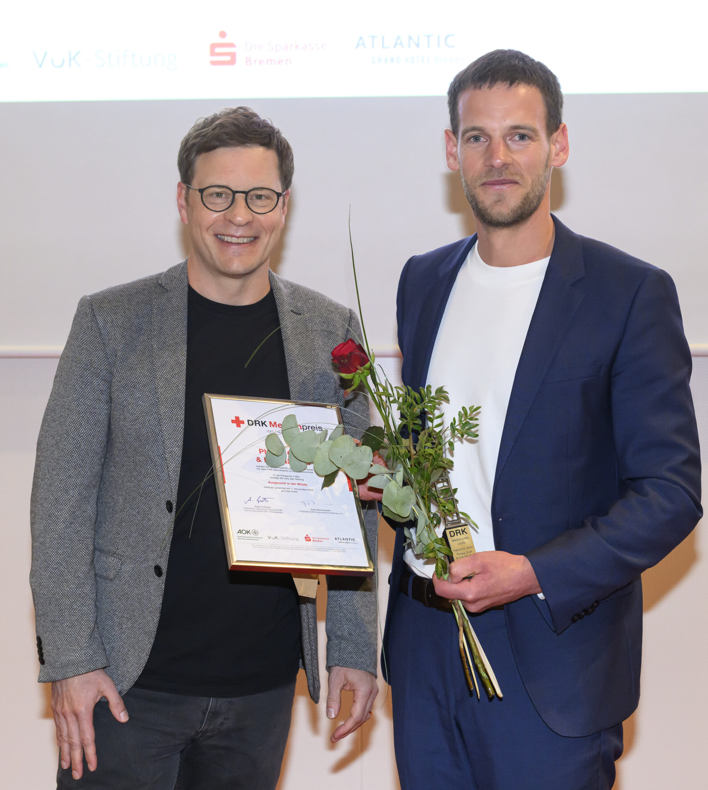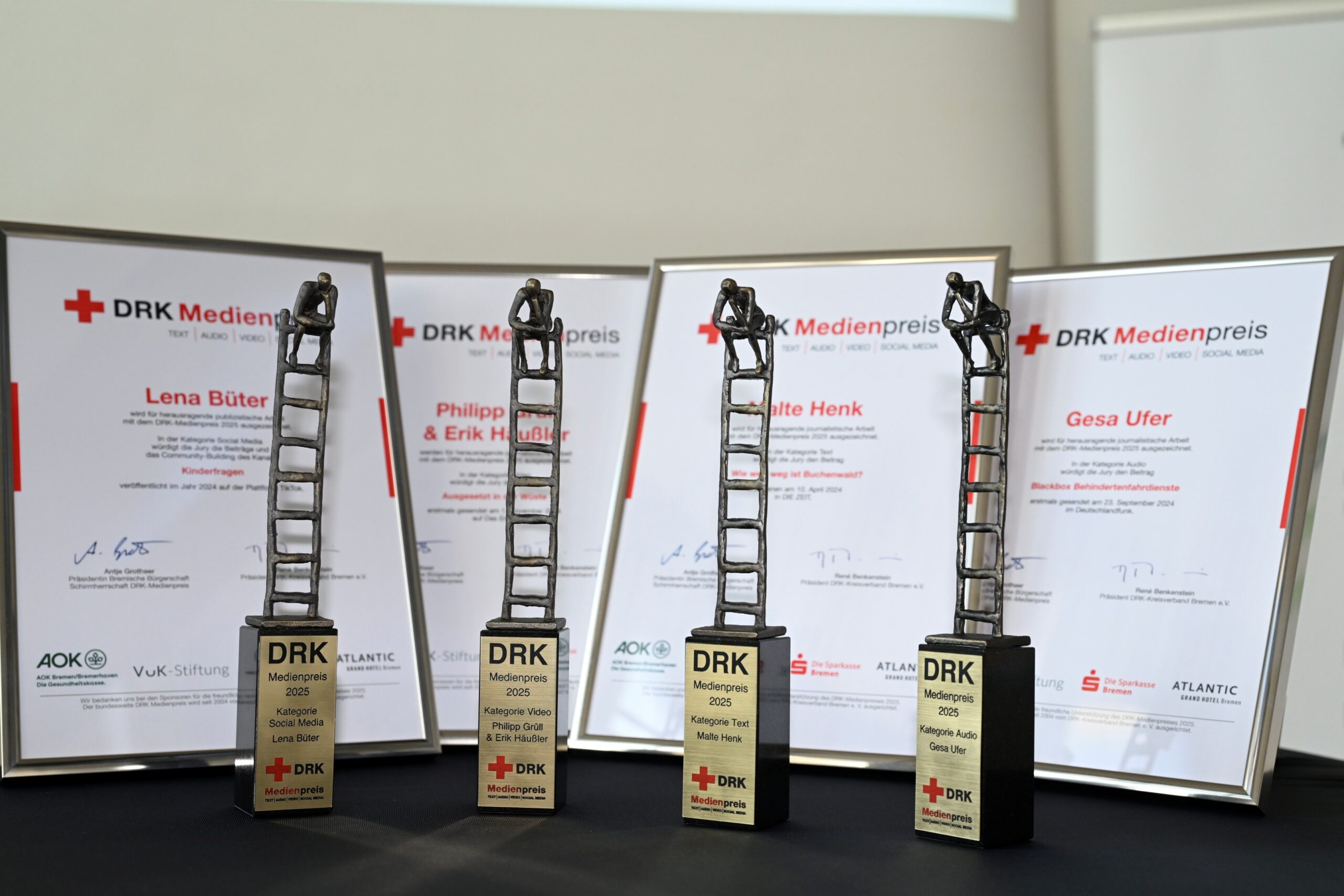 Das Deutsche Rote Kreuz (DRK) zeichnete am Abend des 1. Oktober vier herausragende journalistische Arbeiten in den Kategorien Text, Audio, Video und Social Media mit dem DRK-Medienpreis 2025 aus. Aus über 160 bundesweiten Einsendungen wählte eine neunköpfige Jury aus Bremer Medienexpert:innen die besten Beiträge aus, die aktuelle sozialpolitische Themen beleuchten und Menschen zeigen, die sich in unvorhergesehenen Lebenssituationen befinden. Im Rahmen der feierlichen Preisverleihung im Festsaal der Bremischen Bürgerschaft, moderiert von Kirsten Rademacher (buten un binnen/Radio Bremen), wurden im Beisein der Bürgerschaftspräsidentin Antje Grotheer sowie dem Vorstandsvorsitzenden des DRK-Kreisverbands Bremen, Bernd Blüm, die DRK-Medienpreise 2025 übergeben an: Malte Henk mit „Wie weit weg ist Buchenwald?“ (Kategorie Text), Gesa Ufer mit „Blackbox Behindertenfahrdienste“ (Kategorie Audio), Philipp Grüll und Erik Häußler mit „Ausgesetzt in der Wüste“ (Kategorie Video) sowie Lena Büter mit ihrem Kanal „lena.kinderfragen“ (Kategorie Social Media).